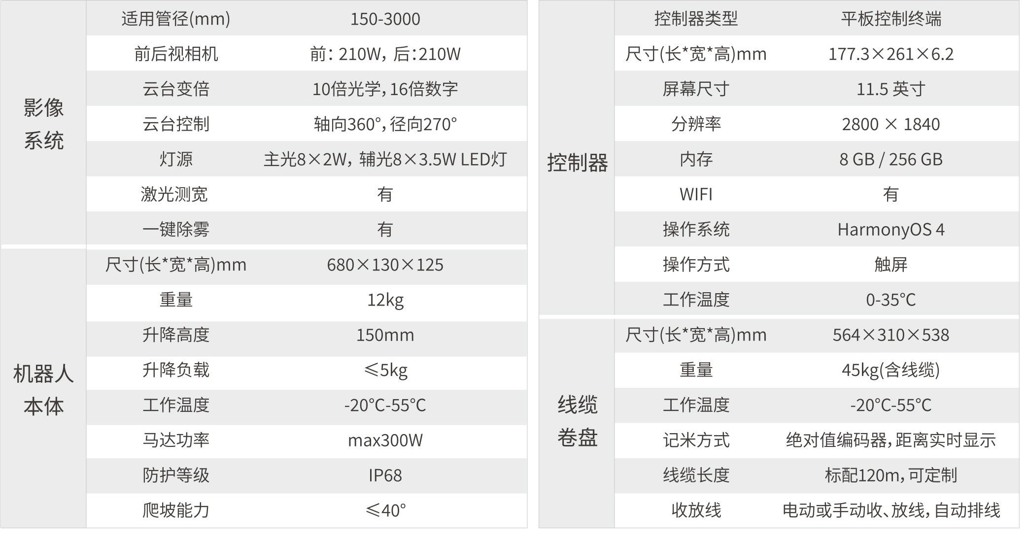 精蛰150是一款可代替人工下井,进入管道内检测作业的数字高清管道检测机器人,主要由机器人本体、双数字高清摄像单元、电动线缆卷盘和平板控制终端组成。应用于市政排水管道检测,最小可进入DN150mm管径。配备强力照明光源和高精度计米线缆卷收装置,可根据车体行进速度自动匹配收放线速度,收线过程自动排线。对管道内部进行视频录像、缺陷抓拍、记录缺陷位置信息及制作专业的管道检测报告。